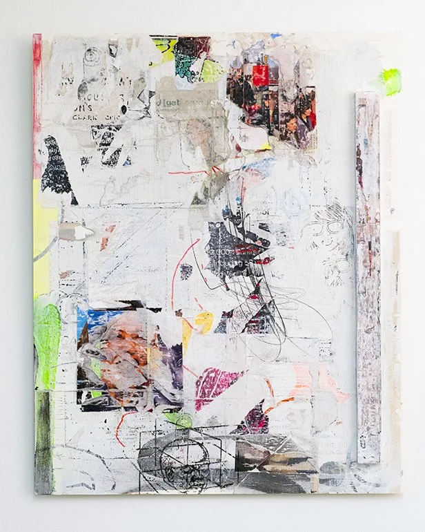 Bubble and Scrape, Krylon spray paint, Sharpie marker, Gorilla glue, enamel paint maker, graphite, toner, newspaper, wood, lime wash, and wheat paste on mixed media collage mounted on Gator board, 24 x 30 inches, 2025.
